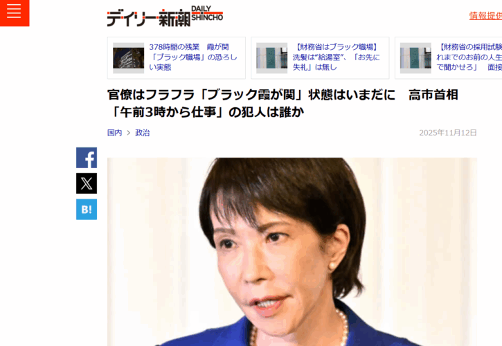 2025年11月12日 デイリー新潮オンライン記事に千正のコメントが掲載「官僚はフラフラ『ブラック霞が関』状態はいまだに ― 高市首相『午前3時から仕事』の犯人は誰か」